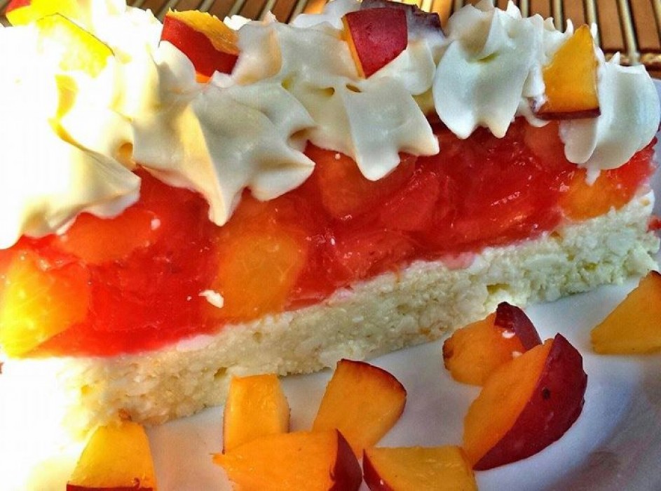 2.5dl kókusztejszínt habbá vertem hozzáadtam 3 zselatin fixet 75dkg túrót egy citrom héjját pici levét, eritrittel édesítettem ízlés szerint. folpackkal bélelt csatos tortaformába öntöttem, hűtőbe tettem pihenni kicsit. Addig 2kg nektarint felkockáztam és zselatinnal és eritrittel felfőztem kb 5 percig. A túró tetejére öntöttem és vissza a hűtőbe. A legnehezebb a várakozás volt mire kidermedt a "torta".